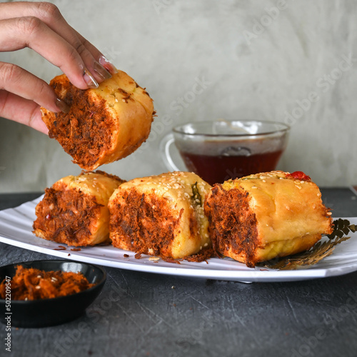 Indonesian snack, Roti gulung abon ikan tuna or Shredded tuna roll on a white folding plate.