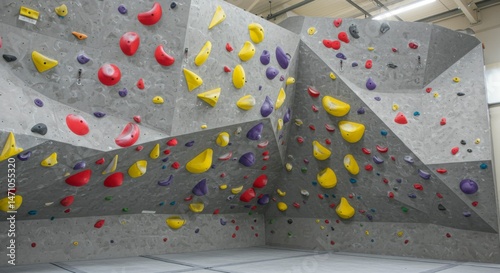 Indoor climbing wall with various colored holds