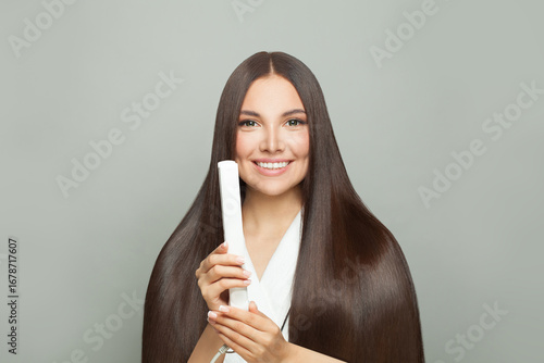 Indoor portrait of woman brunette with long straight smooth hairstyle using hair straightener iron on light grey background