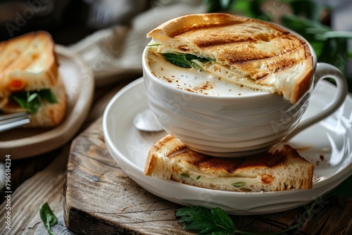 Indulge in a delightful breakfast with hot coffee and a flavorful sandwich combo