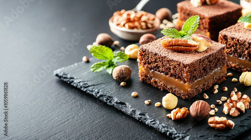 Indulge in decadent brownies a luxurious blend of nuts and caramel on a slate presentation