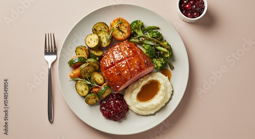 Indulge in this elegant Thanksgiving dinner plate featuring a glistening glazed ham, creamy mashed potatoes, vibrant roasted vegetables, and a dollop of cranberry sauce.