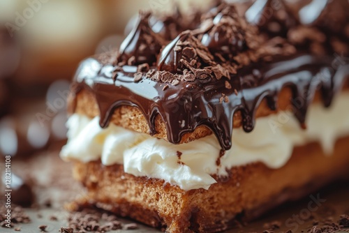 Indulgent chocolate dessert topped with whipped cream and shavings served in a cozy cafe setting during the afternoon