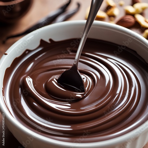 Indulgent melted dark chocolate swirls with a spoon in a white bowl, perfect for baking and dessert.