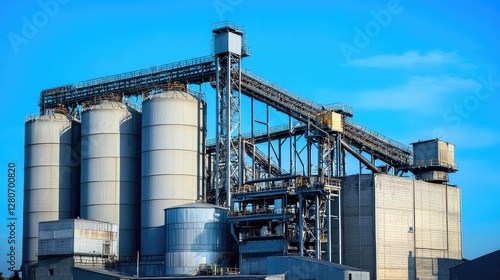 Industrial asphalt plant with silos, conveyors, and storage tanks under a bright blue sky