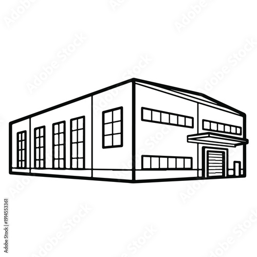 Industrial building with large windows and garage door