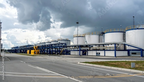 Industrial Chemical Storage Facility with Conveyor Belts Under Clouds