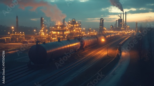 Industrial complex at twilight, illuminated by factory lights.