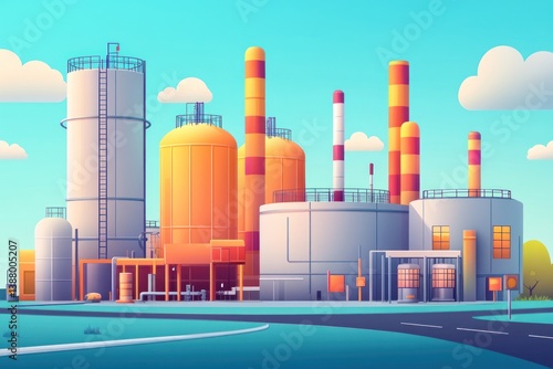 Industrial complex landscape, large tanks, factory, background road, illustration