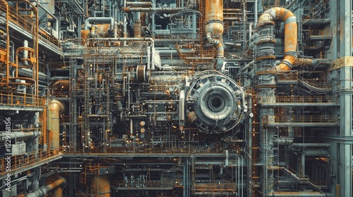 Industrial Complex with Pipes, Gears, and Machinery in Detail