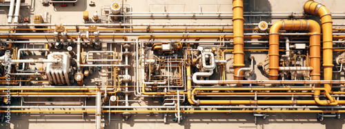 Industrial concept. Pipeline in a factory - valves, tubes, pressure gauges, thermometers. View from above. pipes, flow meter, water pumps and valves of the heating and gas supply system.