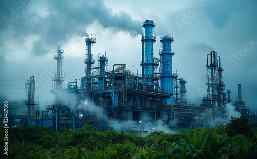 Industrial facility amidst cloudy skies and smoke. A large industrial facility releases smoke into the atmosphere under cloudy skies, surrounded by greenery and fog.
