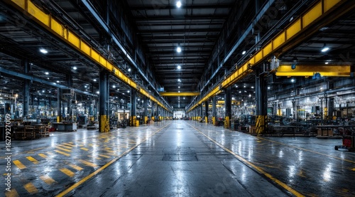 Industrial factory interior, long view. Empty, bright, dark. Heavy machinery