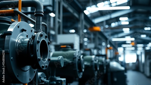 Industrial factory interior showcasing detailed machinery under soft lighting.
