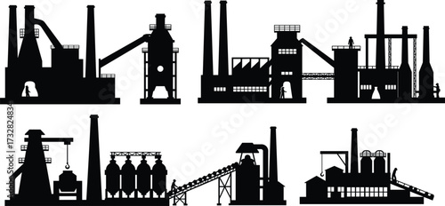 Industrial factory silhouette, manufacturing plant, refinery building, smoke chimney, heavy industry facility
