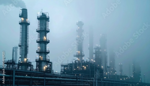 Industrial Factory Silhouetted Against Foggy Sky at Dusk