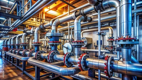Industrial high-pressure piping system with intricate network of steel tubes, valves, and fittings, conveying pressurized gas or liquid in a heavy-duty industrial setting.
