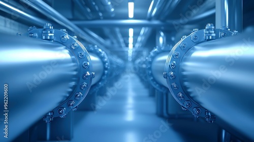 Industrial landscape featuring steel pipelines, valves, and pumps, showcasing an expansive area filled with machinery and equipment reflecting a functional atmosphere.