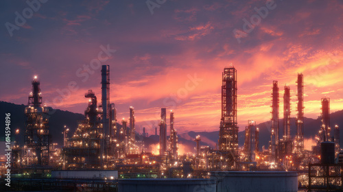 Industrial landscape, refinery, sunset, machinery, smoke, silhouette, energy production