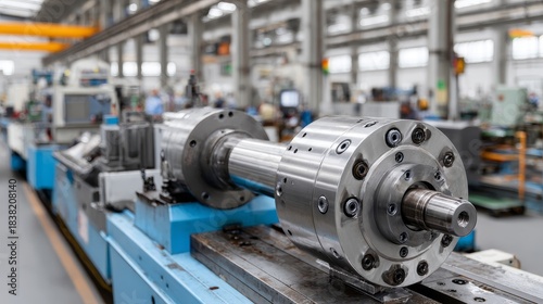 Industrial machine systems horizontal lathe action in a high-tech factory environment with skilled tools and precision