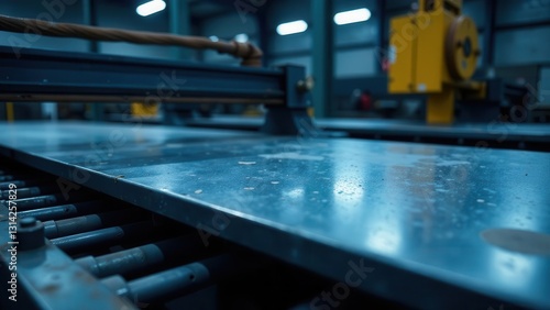 Industrial Metalworking Facility Close-up View of a Steel Sheet on a Conveyor Belt System in a Factory Setting