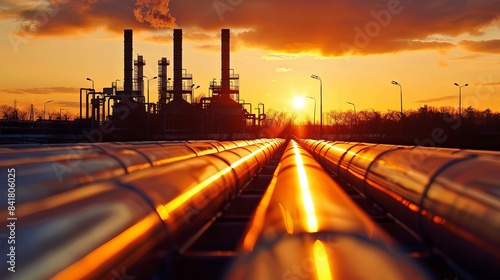 industrial oil refinery plant at sunset dramatic pipe line silhouette landscape