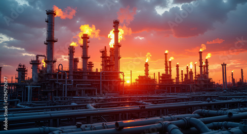 Industrial oil refinery with smoke and flames at sunset, pollution concept. The concept is industry, pollution, energy, and environmental impact.
