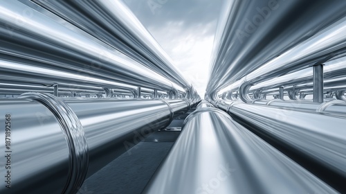 Industrial pipeline system with parallel pipes stretching into the distance under a cloudy sky