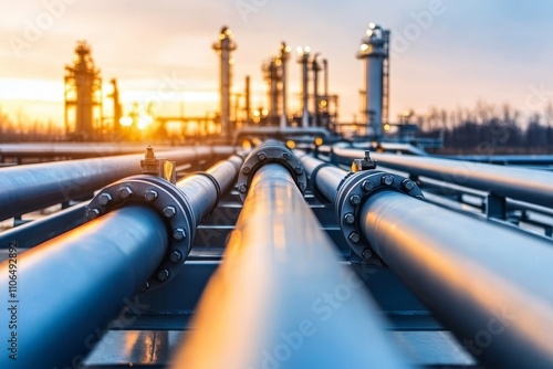 Industrial pipes in a refinery setting at sunset with warm light illuminating the infrastructure and equipment against a dramatic sky in the background