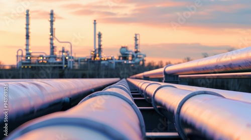 Industrial pipes lead the eye towards a refinery under the colorful evening sky, capturing the blend of human innovation and natural beauty.