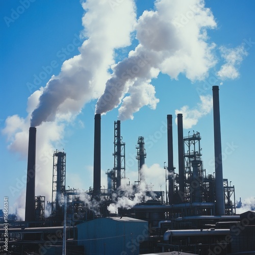 Industrial plant emitting smoke stacks against a clear blue sky.