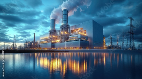Industrial power plant with smokestacks reflecting in water.