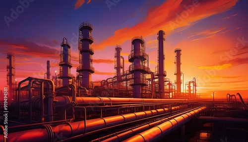 industrial refinery at twilight silhouette of intricate pipelines against fiery orange sky ethereal glow reflecting off metal structures