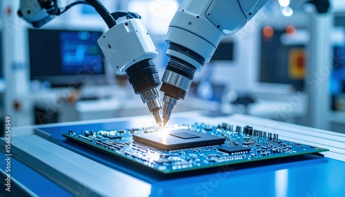 Industrial robot arm precisely soldering a circuit board. The scene showcases technological advancement in a manufacturing environment