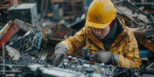 Industrial Salvage: Worker Sorting Through Electronic Waste