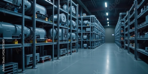 Industrial Storage System with Shelves and Equipment in Warehouse