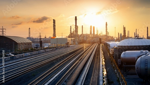 Industrial Sunset: A breathtaking panorama of a sprawling industrial complex silhouetted against a fiery sunset.