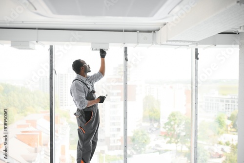 Industrial Theme. Warehouse Heating and Cooling System Installation by Professional Caucasian Technician. Commercial Building Ventilation Rectangle Canals. Air Distribution