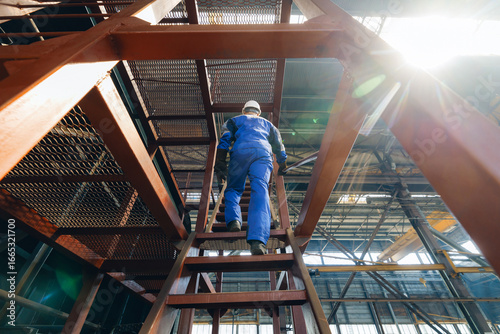 Industrial worker climbing ladder in shipyard under bright sunlight