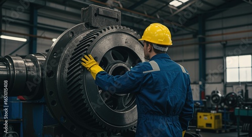Industrial worker inspecting a large gear wheel in a factory setting wearing safety gear and a hard hat for protection