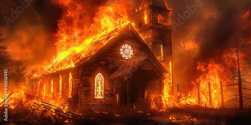 Inferno's Fury: An abstract interpretation of a raging fire engulfing a Wild West church, its flames licking at the charred wooden beams and stained glass windows.