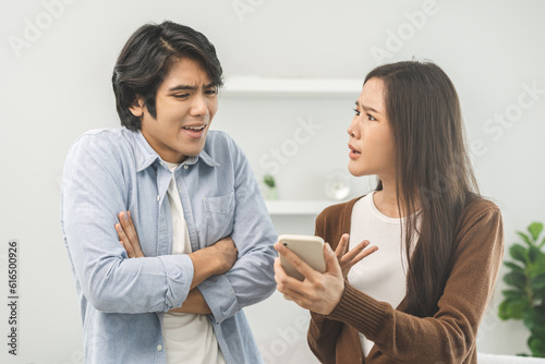 Infidelity, suspicion asian young couple love fight relationship, wife holding cellphone, smartphone cheating on phone, scolding husband about mistrust, distrust and jealousy when sitting at home.