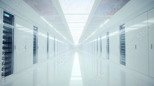 infinite server room stretching into the distance, cool white lighting and tech details, silent and empty