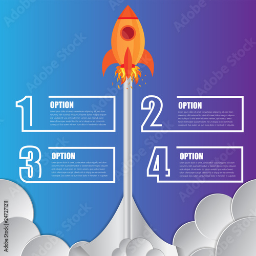 Infographics design template rocket or spaceship launches through the clouds with icons flying up 4 options elements arranged in vertical row and year indication.Concept of four annual steps.