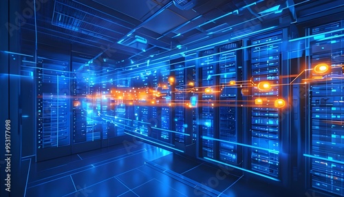 Information traveling through the data center storage in blue and orange colors. Cloud computer system internet infrastructure room, cybersecurity, telecommunication cluster, rack hardware technology