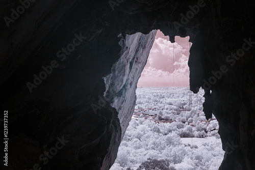 Infrared color, a view from inside a cave looking out toward a landscape filled with trees