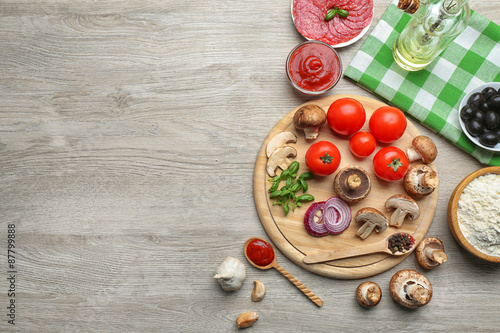 Ingredients for cooking pizza on wooden table, top view
