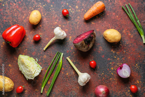 Ingredients for preparing tasty borscht on grunge background
