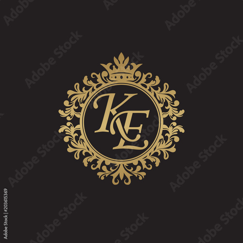 Initial letter KE, overlapping monogram logo, decorative ornament badge, elegant luxury golden color