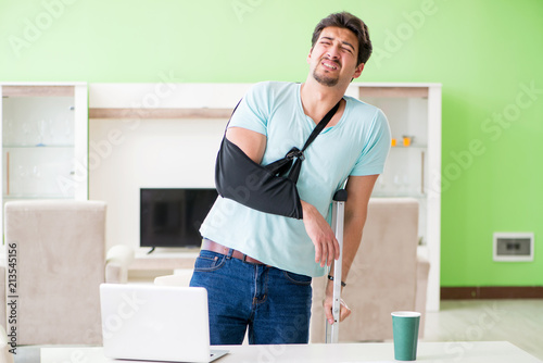 Injured man with crutches sitting at home